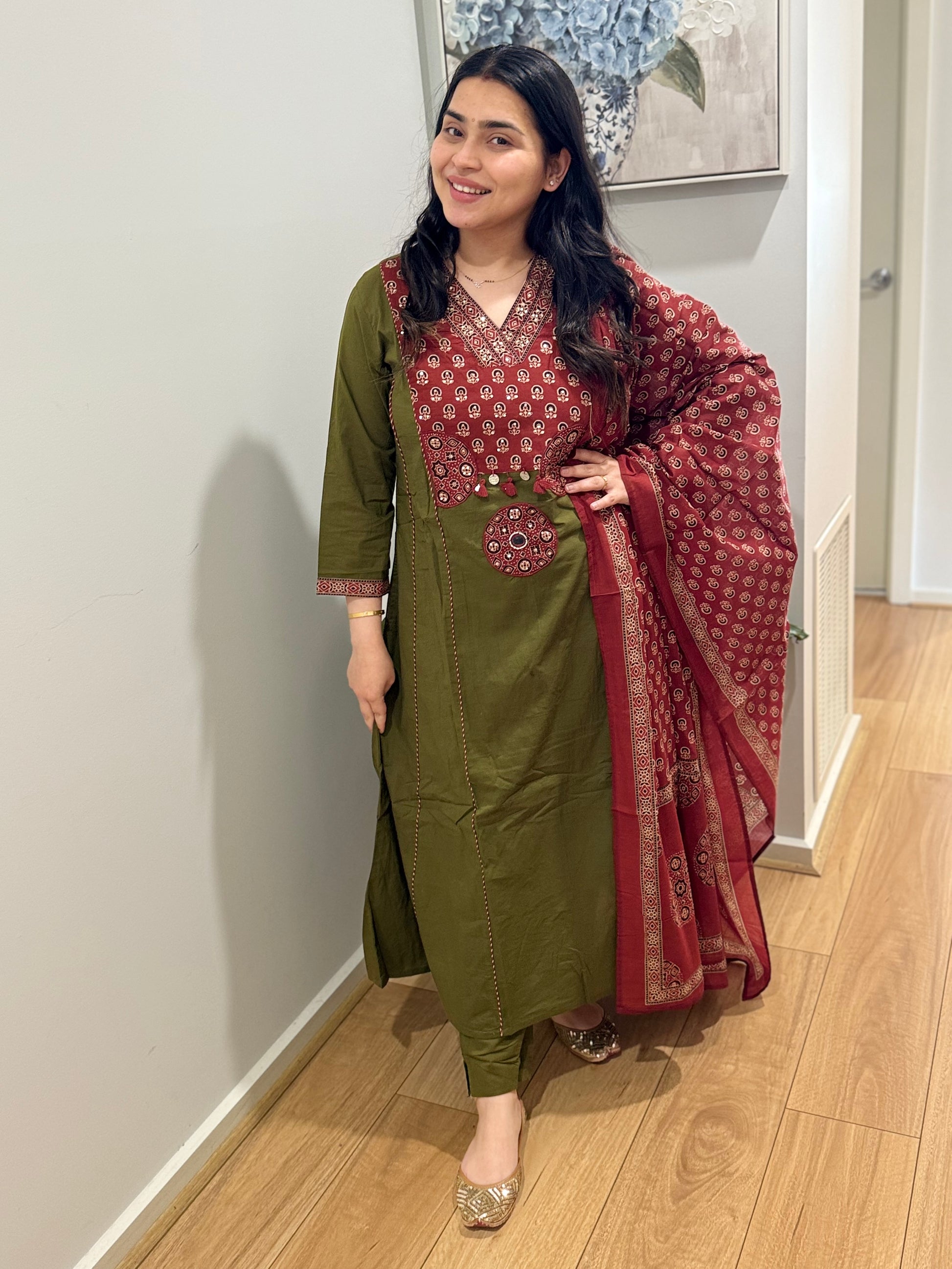 Premium quality cotton suit with pants and printed dupatta in ajrakh style