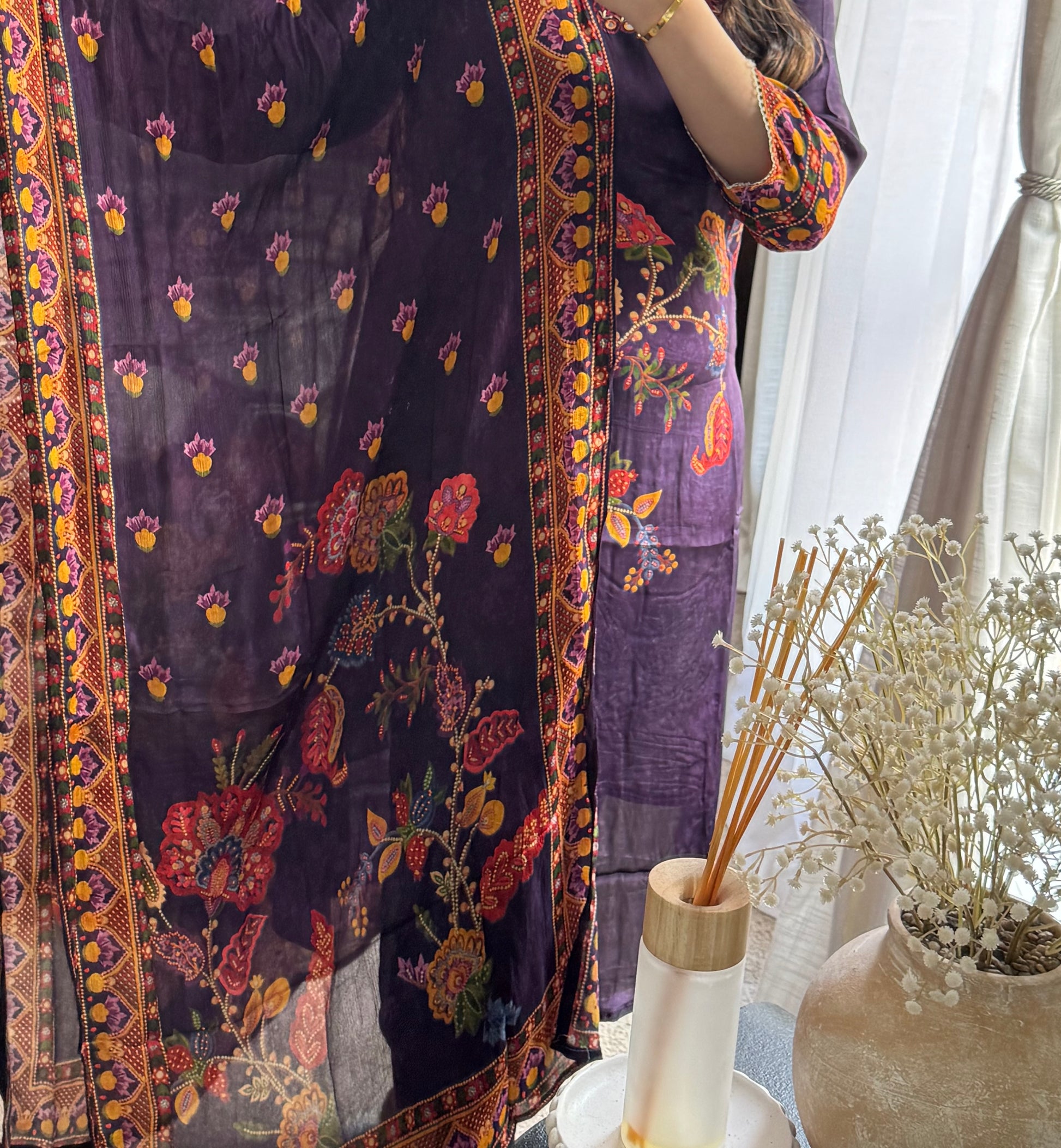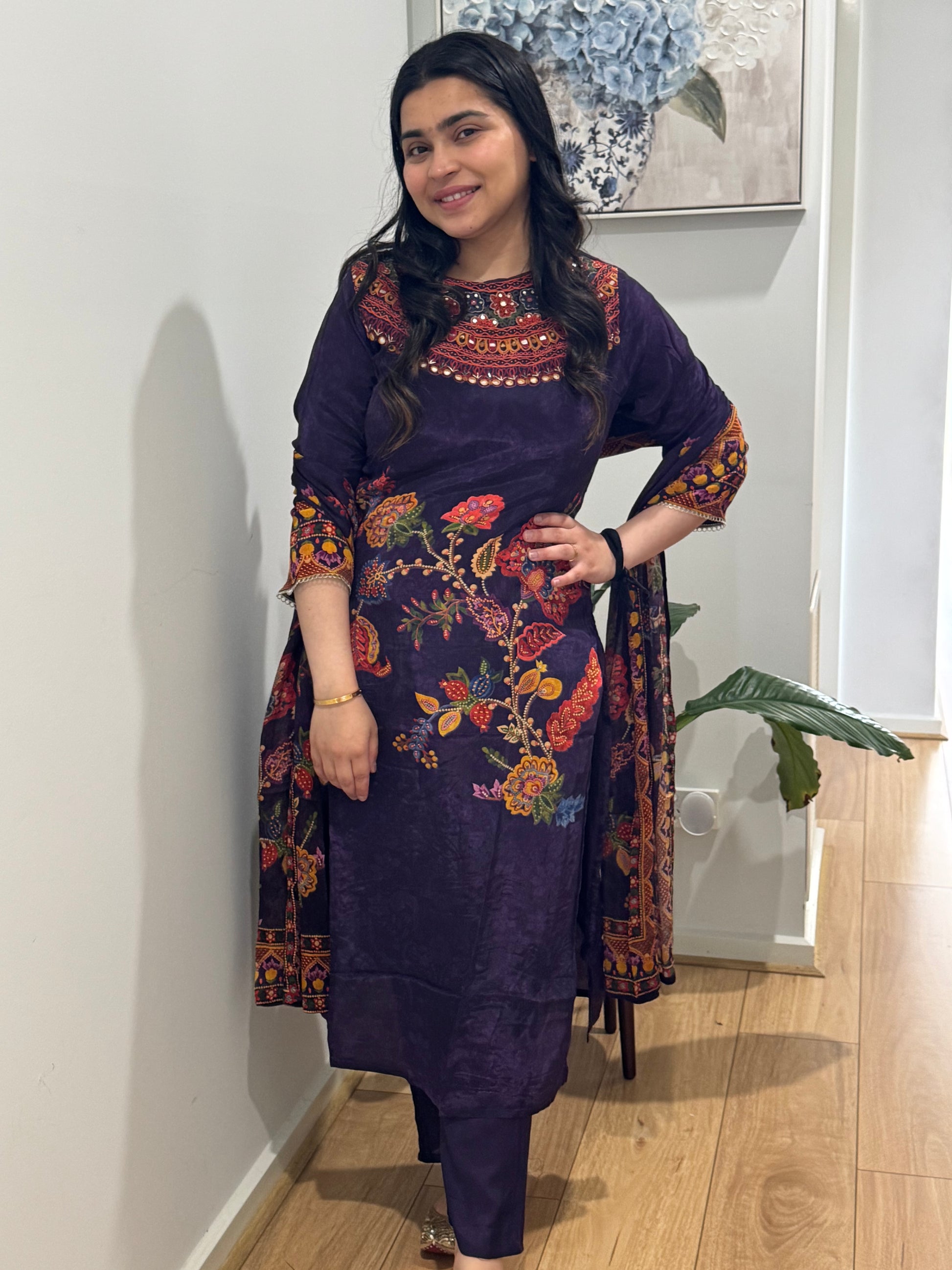 Premium quality natural crape straight suit with chinnon digital printed dupatta and straight pants.