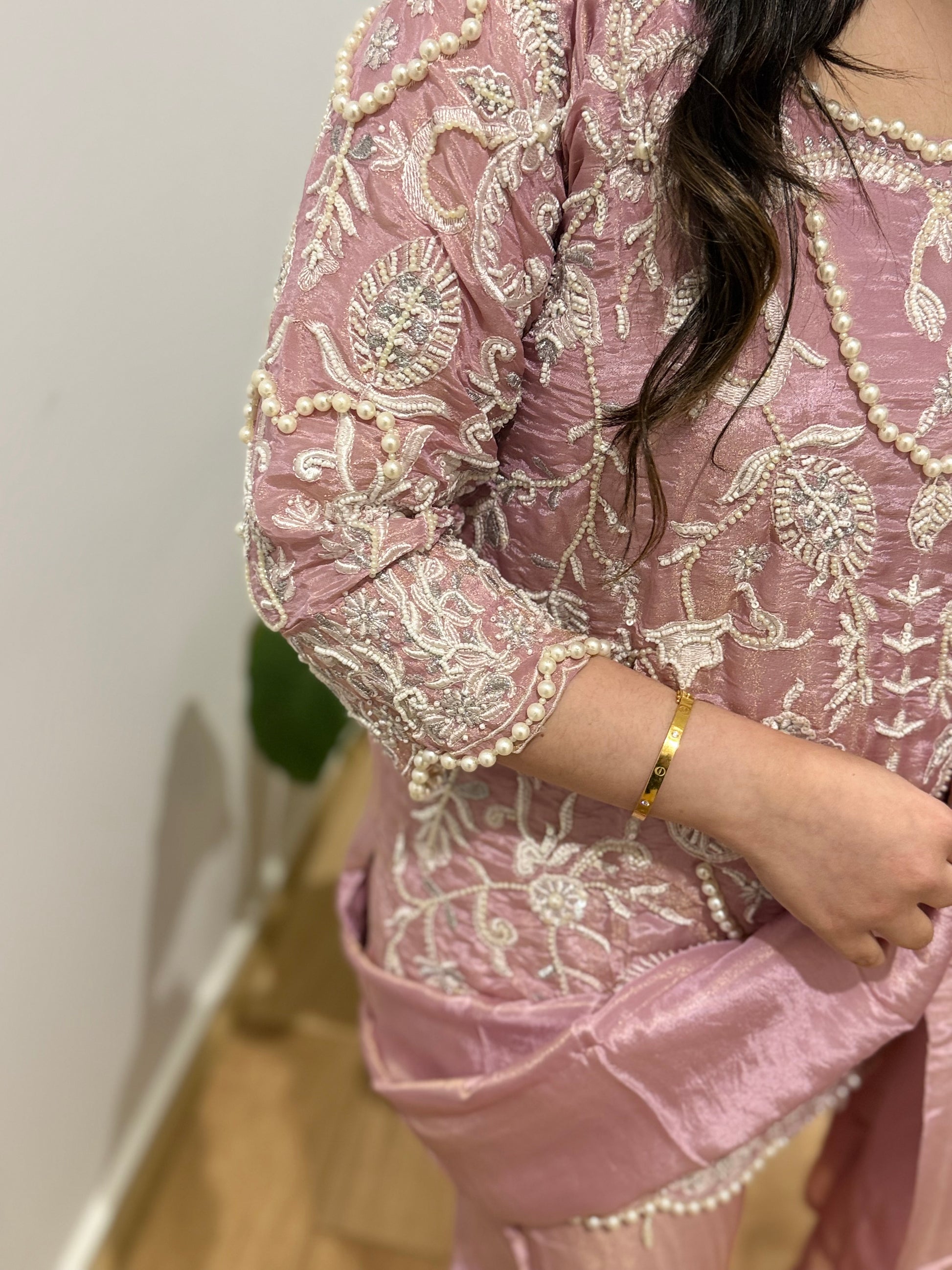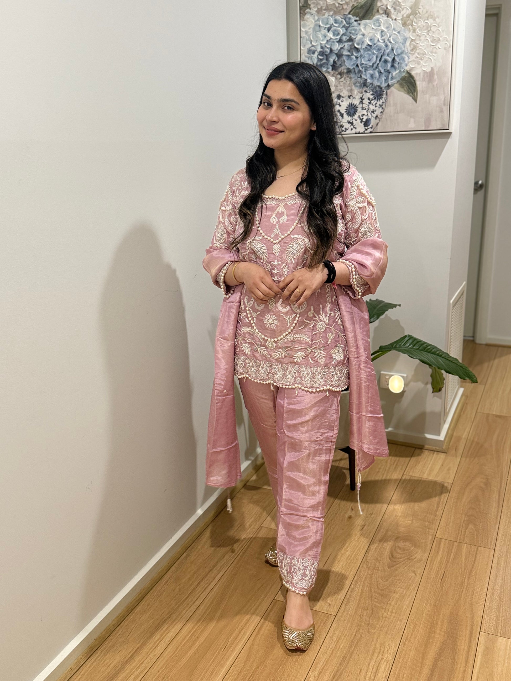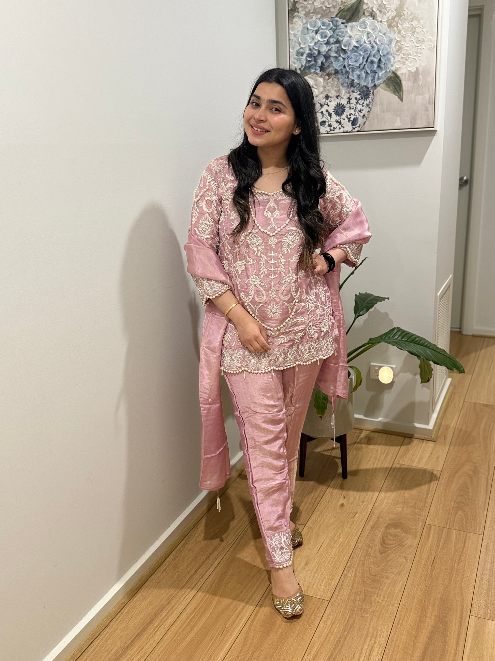 Premium quality silk tissue shimmer short top with hand work and pearl detailing and silk pants and dupatta