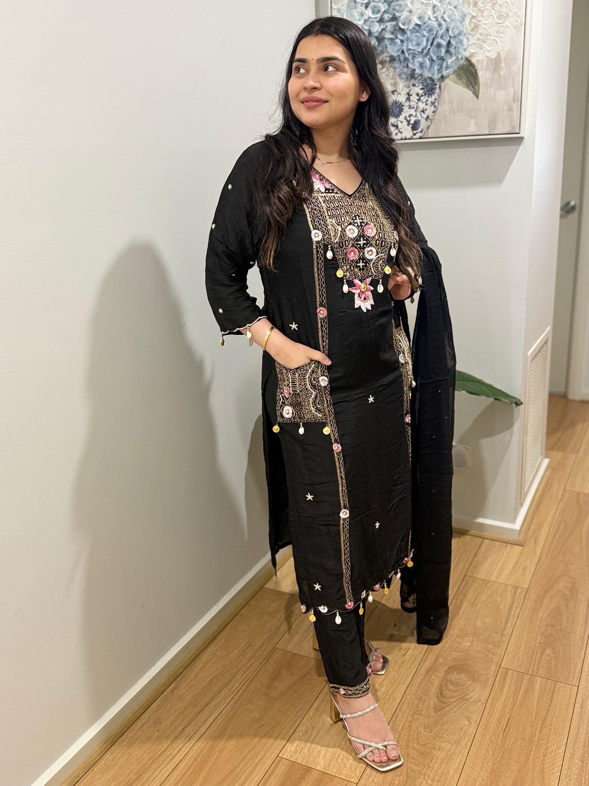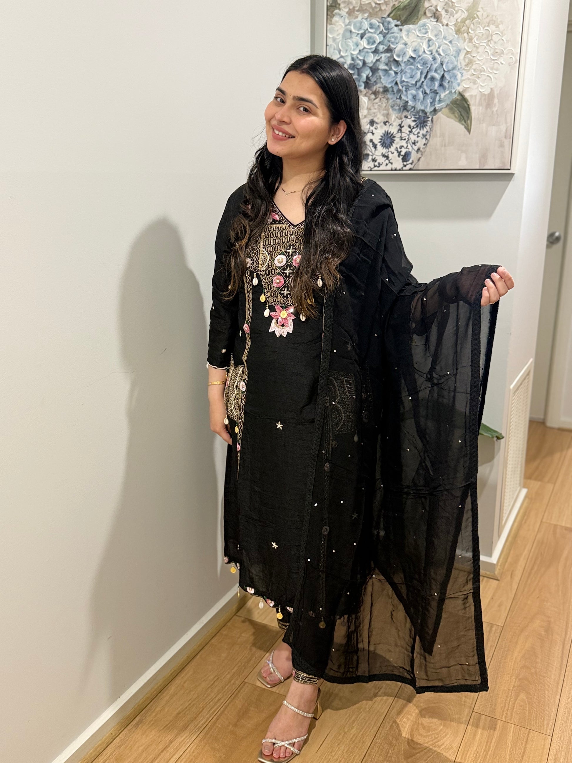 Premium quality silk suit with pants and soft tissue dupatta