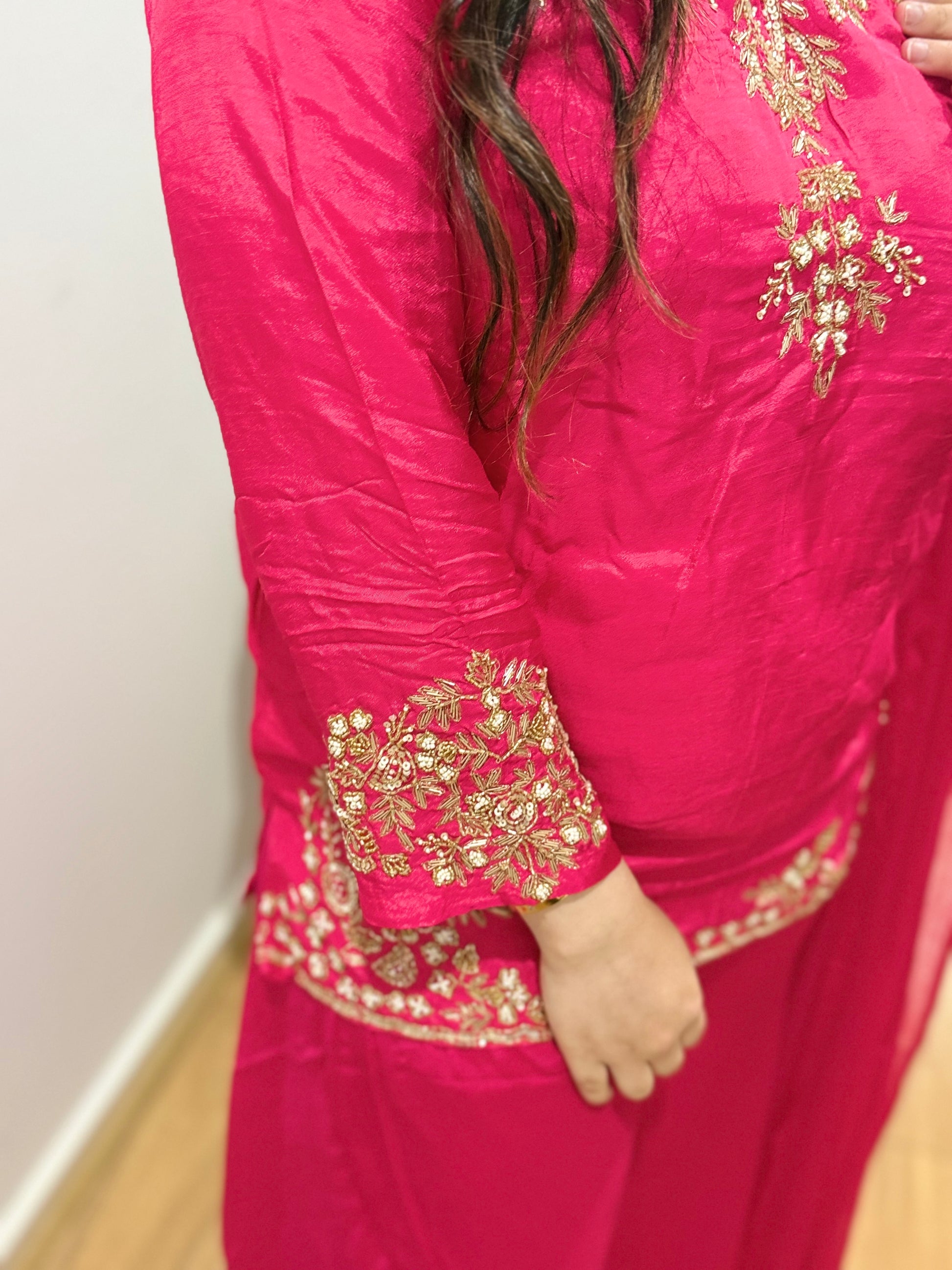Premium quality silk short top with mirror work and chinnon plazzo and tissue dupatta