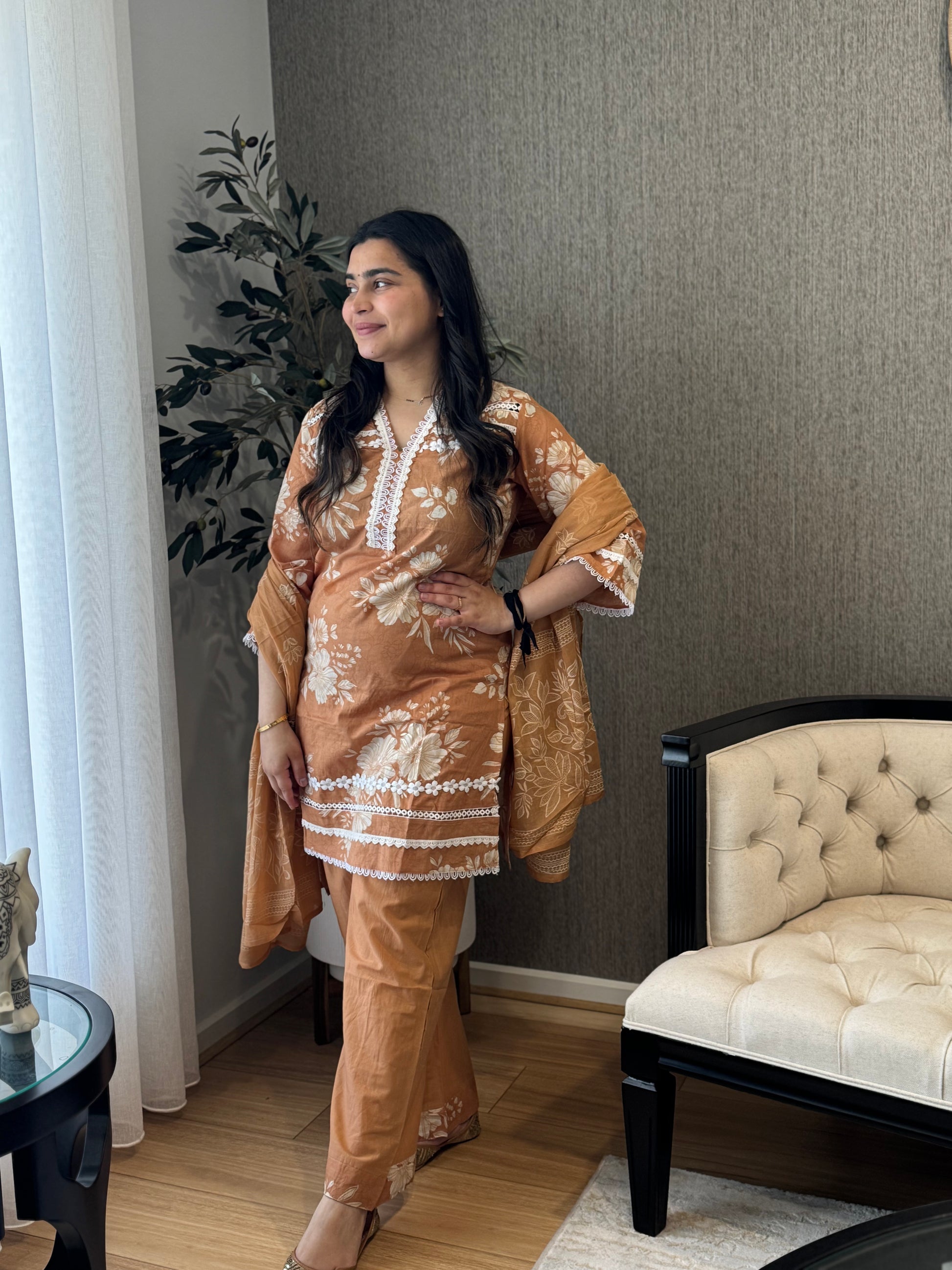 Premium quality cotton straight short suit with block printing dupatta and straight pants.