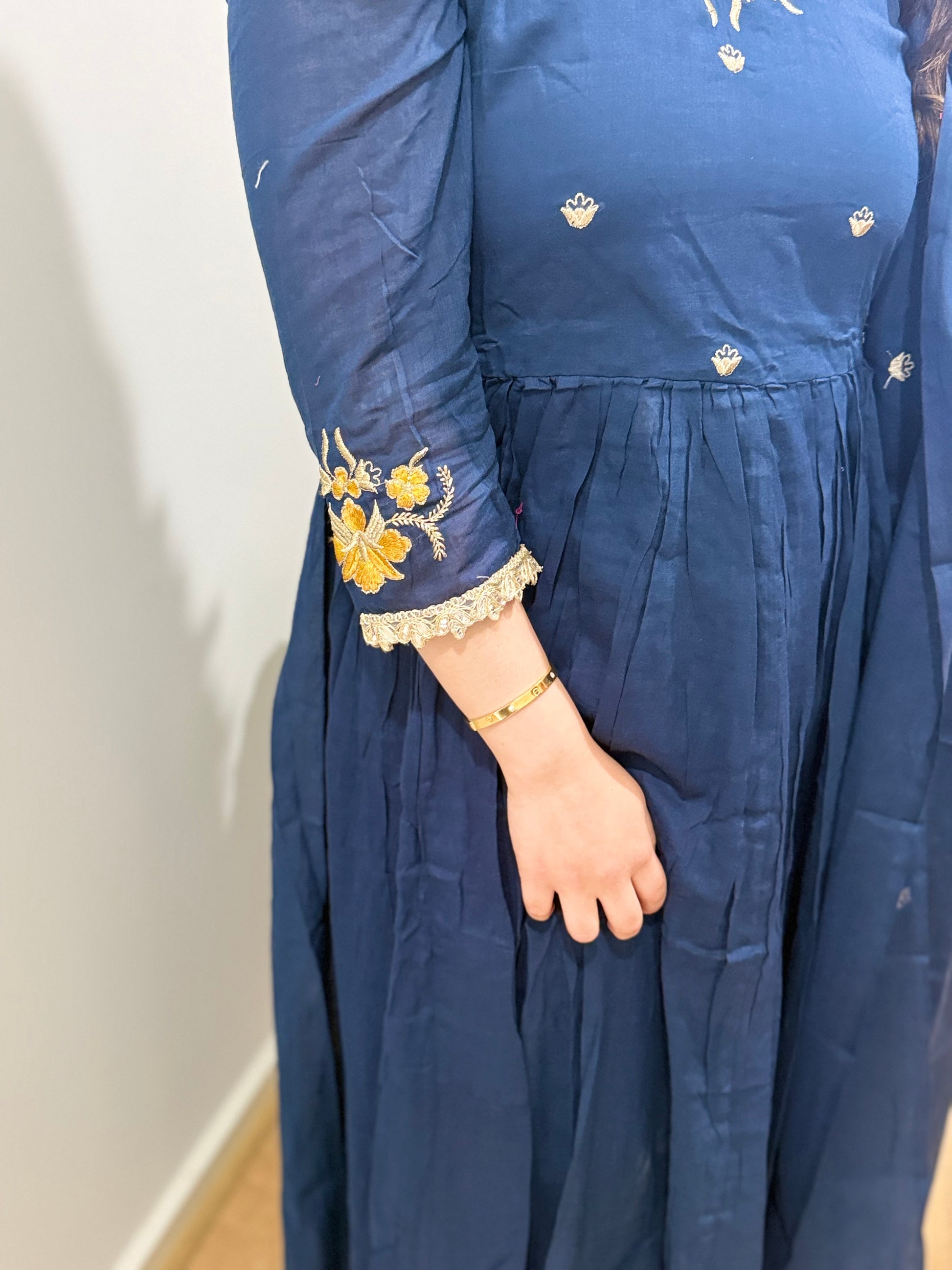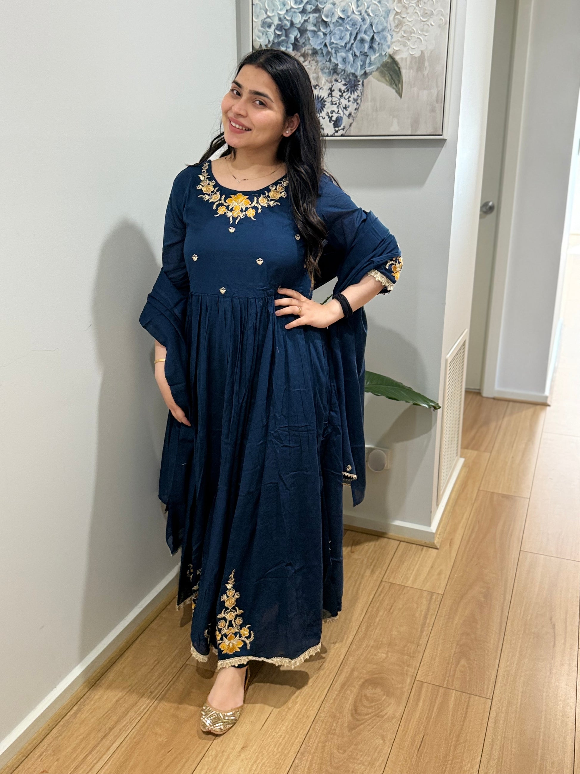 Premium quality mul cotton anarkali suit with half lining and thread work on the yoke and sleeves. Mul cotton dupatta with straight pants.