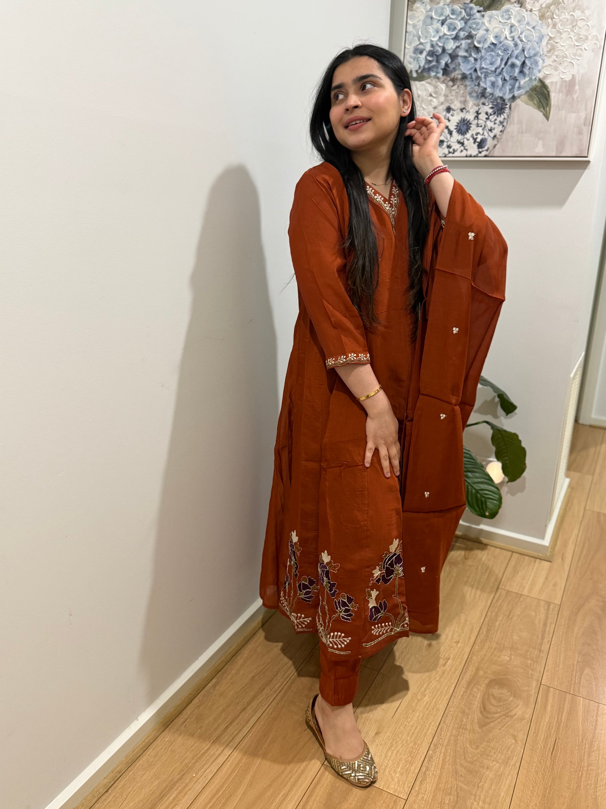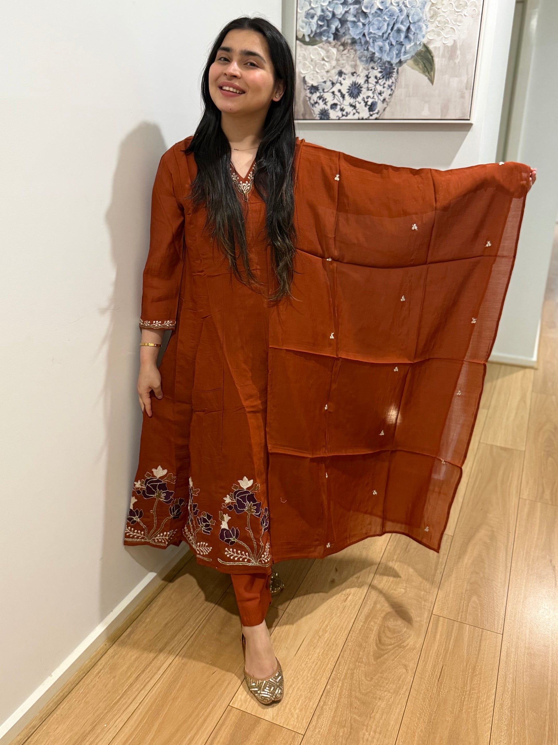 Mulchanderi fabric anarkali with lining, handwork and straight pants and dupatta
