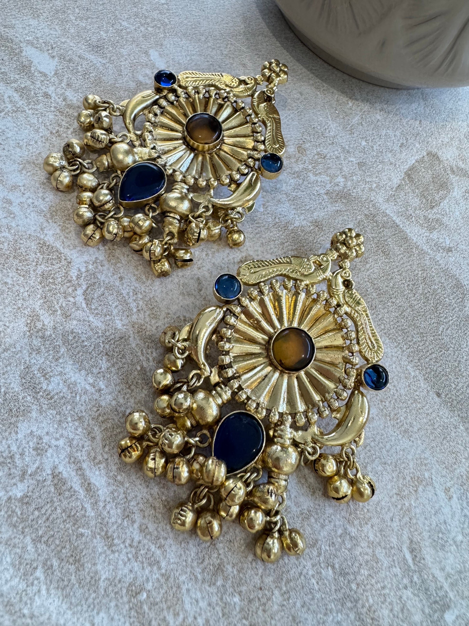 Brass made- lightweight- ghunghroo earrings in gold polishing with monalisa stones in premium and statement finishing.
