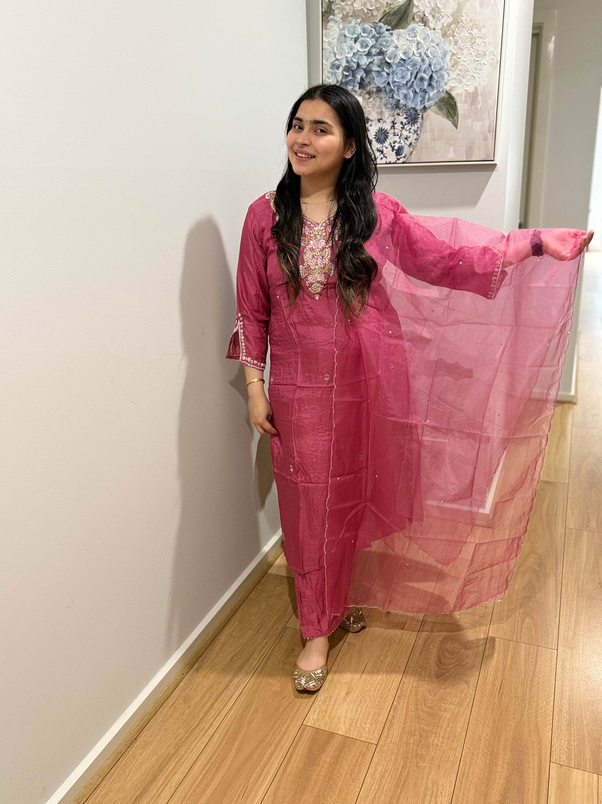 Premium quality silk suit with pants and handwork and tissue organza dupatta